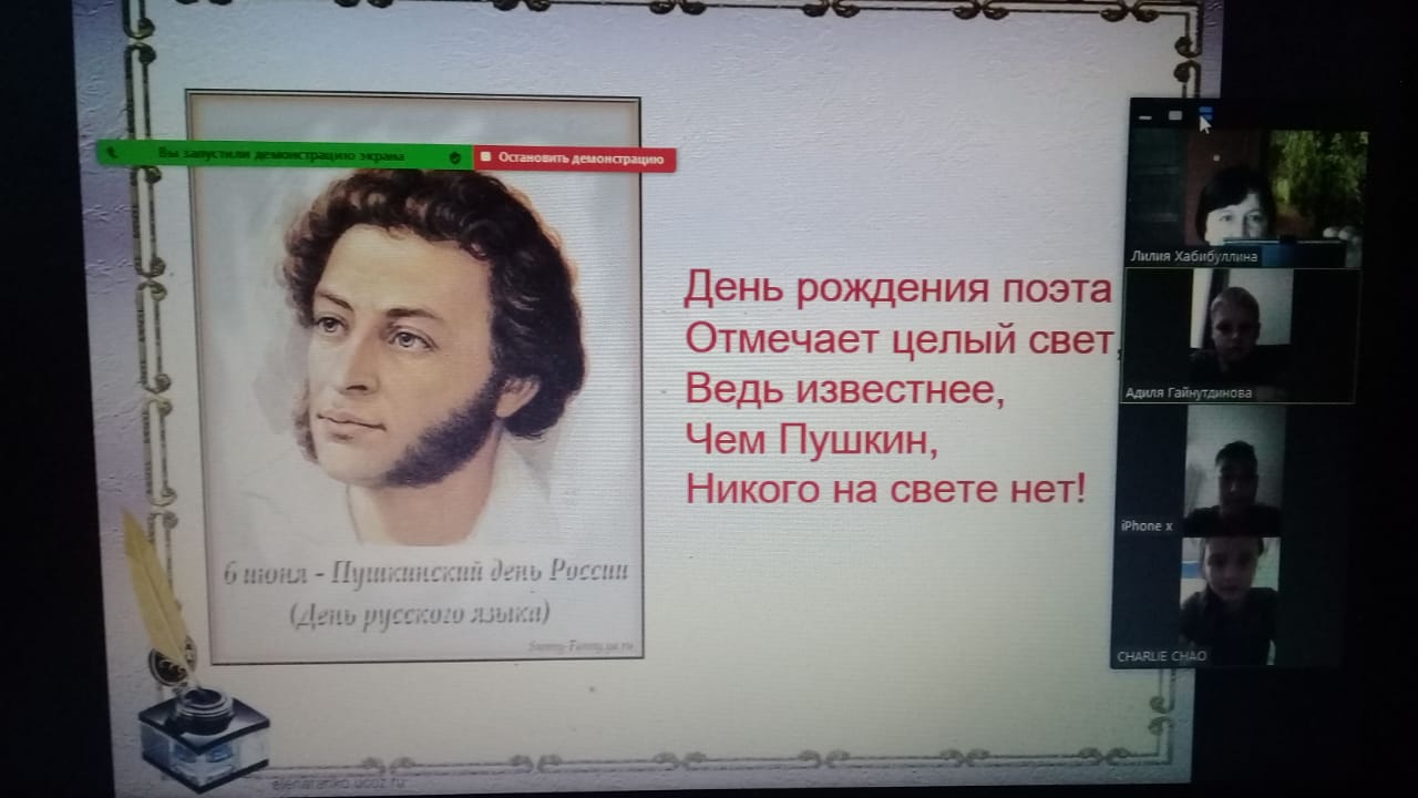 Сегодня учитель русского языка и литературы Хабибуллина Л.Т. на платформе ZOOM провела внеклассное мероприятие "Час занимательного русского языка" для учащихся 5-7 классов, посвященное Пушкинскому дню России.