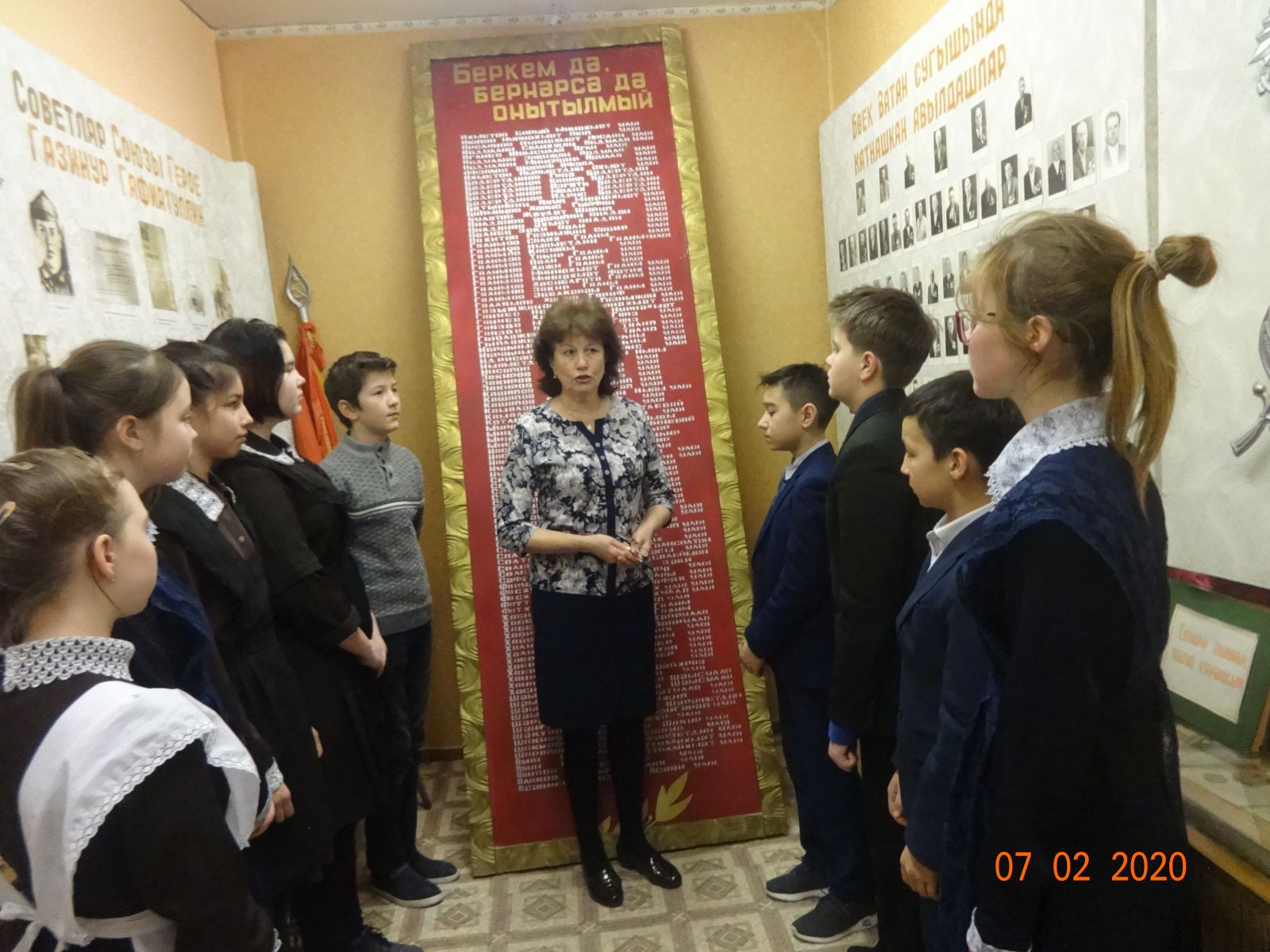 Сегодня, в рамках месячника патриотизма, учащиеся 5-9 класса посетили школьный музей. Руководитель музея Тахавова С.А. рассказала о героях-земляках Газинуре Гафиатуллине и Мисбахе Халиуллине.