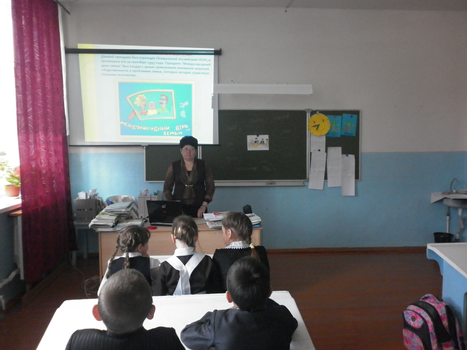 Сегодня в нашей школе прошел Единый урок "Семья и отечество в моей жизни". Учащиеся рассуждали о семейных ценностях. Учителя на различных примерах довели до сознания детей о том, что финансовое благополучие не самое главное в семье, главнее - целостность семьи, т.е. присутствие в семье всех ее членов, их здоровье. В ходе урока учащиеся нарисовали рисунки своих семей.