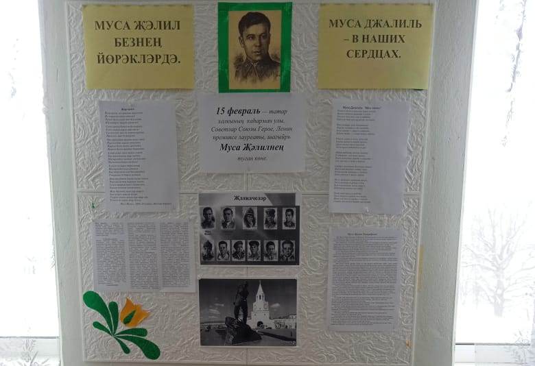 Сегодня исполнилось 116 лет со дня рождения поэта-патриота, Героя Советского Союза, лауреата Ленинской премии, выдающегося татарского поэта М. Джалиля. В связи с этим в школьной библиотеке была организована выставка “Джалиль в наших сердцах”.