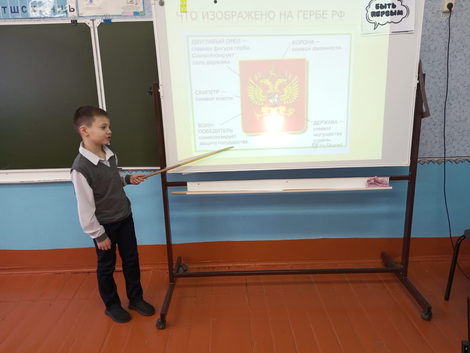 Согласно Федеральному конституционному закону «О Государственном гербе Российской Федерации», герб России представляет собой четырёхугольный, с закруглёнными нижними углами, заострённый в оконечности красный геральдический щит с золотым двуглавым орлом, поднявшим вверх распущенные крылья. Орел увенчан двумя малыми коронами и - над ними - одной большой короной, соединенными лентой. В правой лапе орла - скипетр, в левой - держава. На груди орла, в красном щите, - серебряный всадник в синем плаще на серебряном коне, поражающий серебряным копьём черного опрокинутого навзничь и попранного конём дракон. Это один из древних символов борьбы добра со злом, света с тьмой, защиты Отечества. Восстановление двуглавого орла как Государственного герба России олицетворяет неразрывность и преемственность отечественной истории.