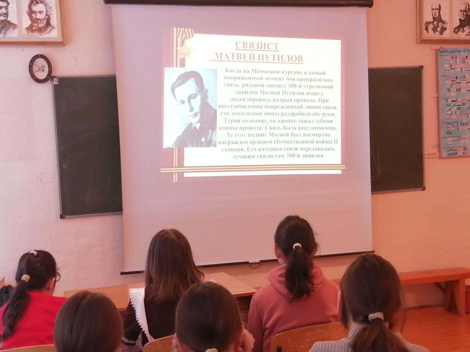 Сегодня в школе был организован урок Мужества, посвященный 80-летию победы в Сталинградской битве. Дети познакомились с важнейшими датами битвы, узнали о трагическом дне бомбардировки Сталинграда – 23 августа 1942 года. Дети вспомнили о беспримерном мужестве защитников города, среди которых снайпер Василий Зайцев, связист Матвей Путилов, Михаил Паникаха и многие другие. Также ребята побывали на виртуальной экскурсии по памятным местам Волгограда, ведь в городе-герое свыше 200 исторических мест, связанных с его героическим прошлым. Среди них мемориальный ансамбль «Героям Сталинградской битвы» на Мамаевом кургане, Дом солдатской славы (Дом Павлова) , музей-панорама «Сталинградская битва»…