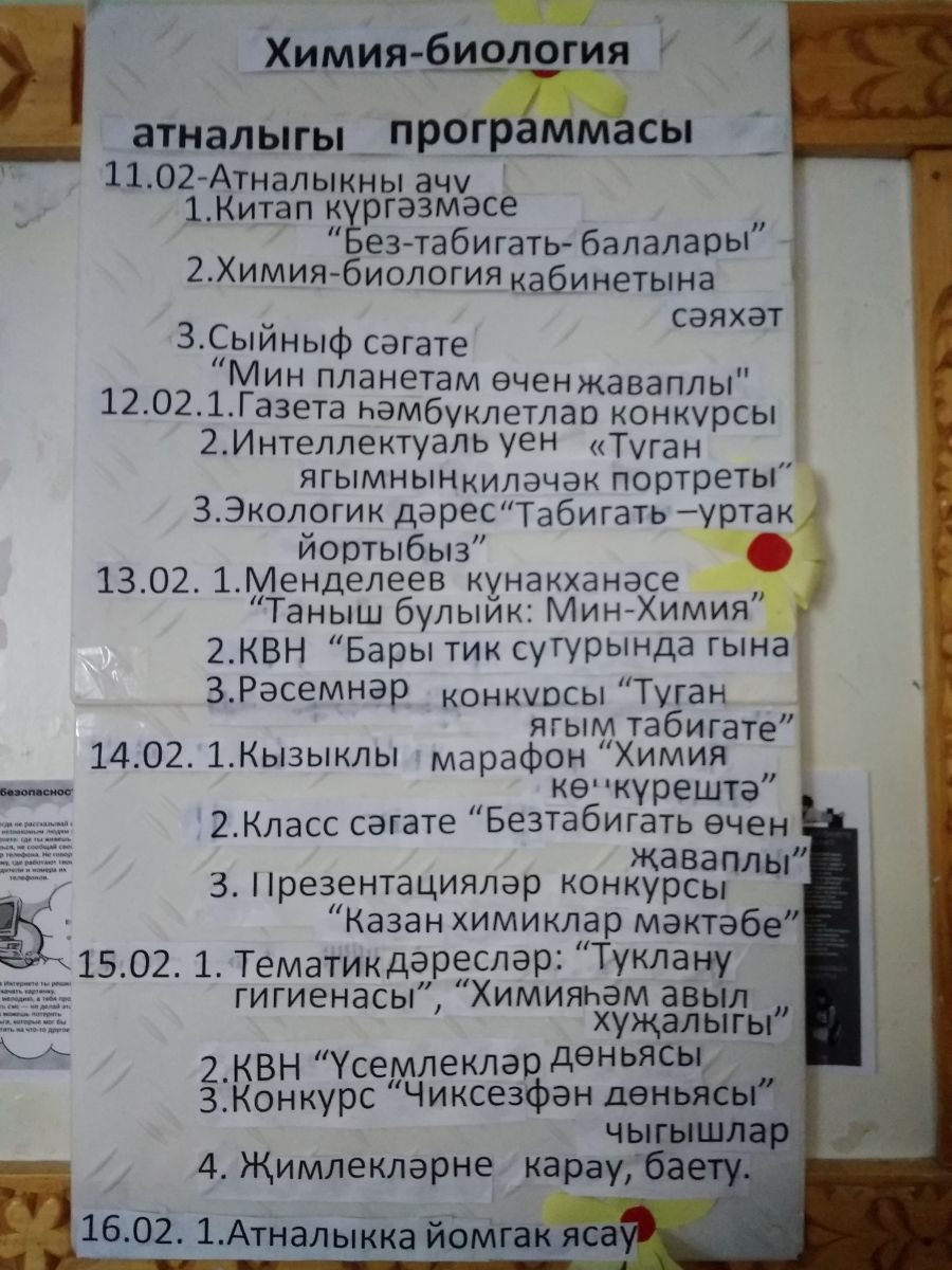 Мәктәптә "Химия биология атналыгы" на старт бирелде. Бүген китапханәдә "Без-табигать балалары" дигән китап күргәзмәсе, башлангыч класс укучылары өчен химия биология кабинетына сәяхәт, 5-9 класс укучылары өчен "Мин планетам өчен җаваплы" дигән сыйныф сәгате үткәрелде.