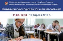 Республиканское родительское интернет-собрание 11.04.2018 13 апреля 2018 года с 11.00 до 12.30 состоится Республиканское Родительское Интернет - Собрание по теме "Можно ли на ЕГЭ идти с удовольствием?" (Об эффективных методиках подготовки детей и подростков к аттестации знаний) online - трансляция на сайте киу.рф. Задайте свой вопрос по адресу : roditelirt@mail.ru