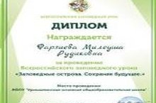 Поздравляем!!! 27.02.2017 За проведение Всероссийского заповедного урока "Заповедные острова. Сохраняя будущее" учительница биологии Фарзиева М.Р. награждена Дипломом ЭкоЦентра "Заповедники", а школа награждена Благодарностью. Поздравляем!!!