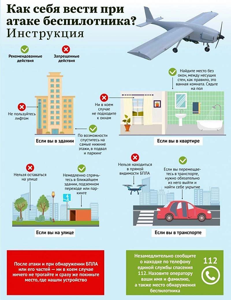 Если БПЛА настиг гражданина на улице, то необходимо как можно быстрее зайти в ближайшее здание, спуститься в подземный переход или паркинг. А если в транспорте – то нужно выйти и найти укрытие.