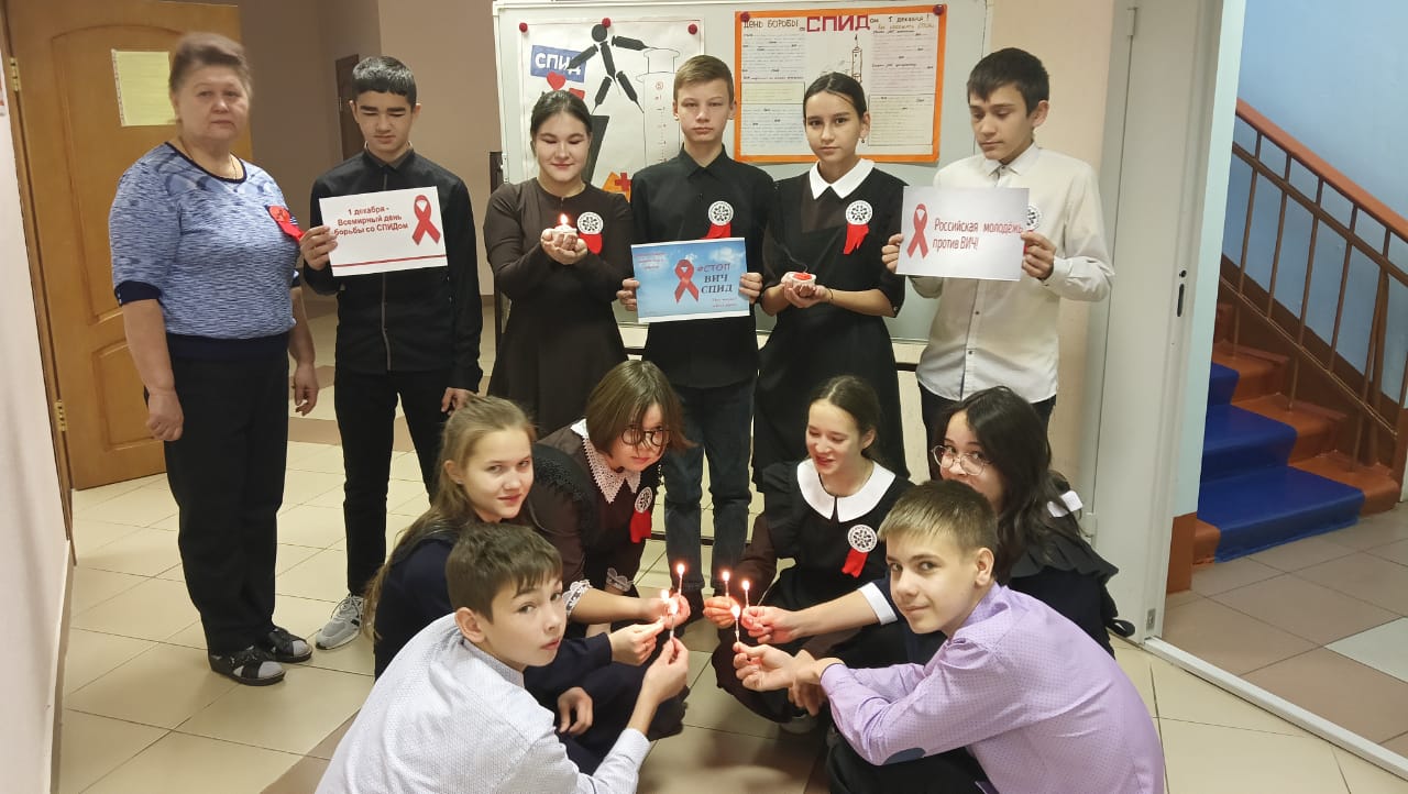 Учащиеся отряда SMS- дети присоединились к акции «Количество свечек зависит от тебя» с целью почтению памяти умерших от СПИДа и дать живым задуматься о здоровом образе жизни. Они выступили перед учащимися о соблюдении здорового образа жизни, о необходимости избегать форм поведения, опасных для жизни и здоровья, что является эффективнаой профилактикой ВИЧ – инфекции. Был оформлен стенд в фойе школы и розданы красные ленточки.