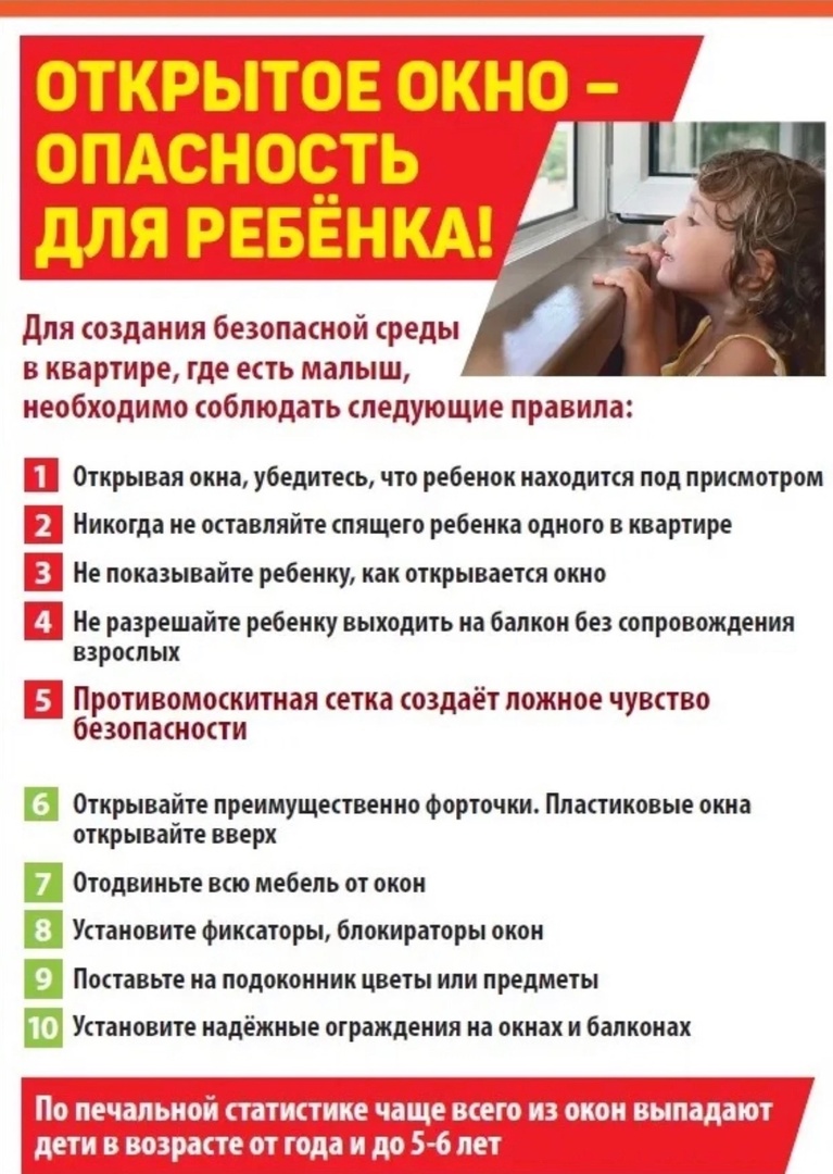 1 ПРАВИЛО: Не оставлять окно открытым, поскольку достаточно отвлечься на секунду, которая может стать последним мгновением в жизни ребенка или искалечить ее навсегда.