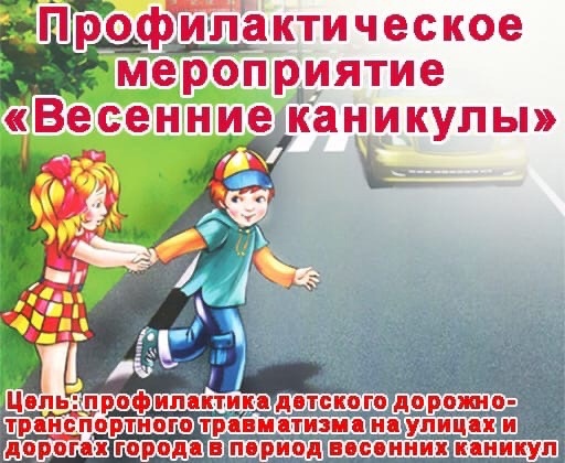 Опубликовано: 20.03.2025В период с 21 марта по 1 апреля 2025г в целях защиты жизни и здоровья детей от угрозы ДТП, предупреждения дорожно-транспортных происшествий с участим несовершеннолетних детей в период весенних каникул на проводится оперативно-профилактическая акция "Весенние каникулы".
