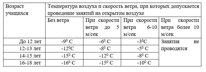 Проведение занятий по физической культуре в зимний период на открытом воздухе допускается при следующих погодных условиях (СанПиН 2.4.2.2821-10):