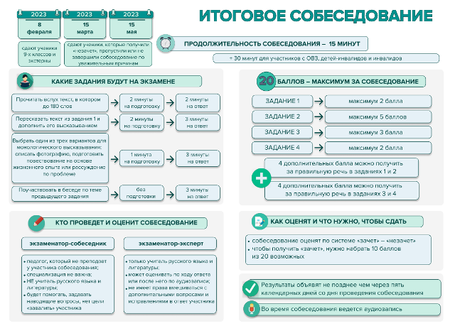 Успешная сдача итогового собеседования является для выпускников 9 классов условием допуска к государственной итоговой аттестации.Участникам итогового собеседования было предложено выполнить четыре задания: чтение текста вслух, его пересказ с привлечением дополнительной информации, монологическое высказывание по одной из выбранных тем и диалог с экзаменатором-собеседником.На выполнение работы каждому участнику отводилось в среднем 15 минут. Итоговое собеседование оценивается по системе «зачет»/«незачет». -