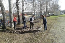 Сегодня учащиеся школы убрались в парке и яблоневом саду.