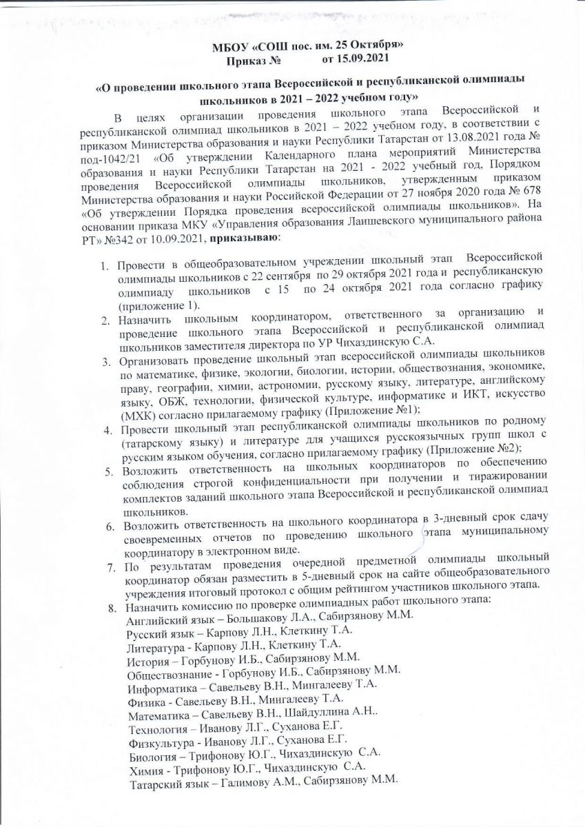 Приказ МКУ № 342 от 10.09.21 ШЭ Всероссийской и Республиканской олимпиады школьников