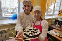 Так, мальчики из 5 Б класса готовили блины , а девочки -роллы.