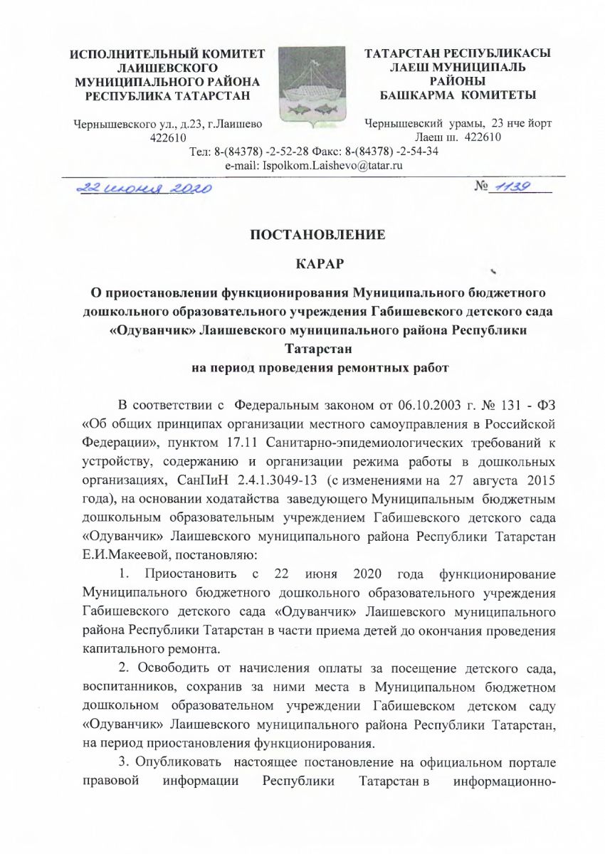 Внимание, уважаемые родители! ПОСТАНОВЛЕНИЕ О приостановлении функционирования МБДОУ Габишевского детского сада "Одуванчик" на период проведения ремонтных работ.