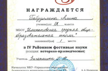 ПОЗДРАВЛЯЕМ ученицу 9 класса Габдуллину Алину занявшую 2 место в IV районном фестивале наук, секция историко-краеведческая. Руководитель Зиганьшина Г. Н.