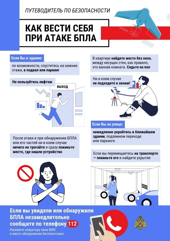 Если вы сделали фотографии или видеозаписи БПЛА, передайте их сотрудникам полиции. Но ни в коем случае не распространяйте видео- и фотоматериалы в социальных сетях или сети Интернет - это может помочь противнику выполнить корректировку и повторить атаку.
