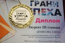 В Республиканском творческом конкурсе ГРАНИ УСПЕХА приняла учатсие и стала Лауреатом III степени ученица "Детской школы искусств" г. Лаишево Денисова Елена (преподаватель Кругликова М.П.).