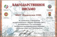 МБОУ "Нармонская СОШ" получила благодарность за содействие в проведении республиканского "Марша Памяти - 2017", посвященного 75-й годовщине Любанской наступательной операции советских войск под Ленинградом. 13.03.2017