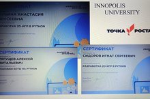 Вот и закончился еще один учебный год. Мы плодотворно поработали и вот наши результаты. В 2021-2022 учебном году учащиеся нашей школы, в том числе и центра «Точка роста», успешно закончили обучение в INNOPOLIS UNIVERSITY по программе «Разработка 2-D –игр в python» и «TELEGRAM- боты на python»: Сидоров Игнат , Марьина Анастасия – выпускники 9 класса, Тягущев Алексей выпускник 11 класса. Наши дети молодцы!!! Желаем вам успехов в дальнейшей учебе! 26.06.2022