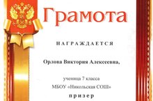Орлова В. 7 класс призер по биологии муниципального этапа Всероссийской олимпиады школьников (учитель Салимуллина Е.А.)