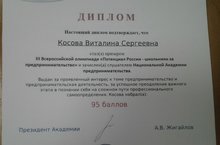 Ученица 7 класса МБОУ"Никольская СОШ" Косова В. приняла участие во Всероссийской олимпиаде "Потенциал России-школьники за предпринимательство",получила диплом призера и зачислена слушателем Национальной Академии предпринимательства
