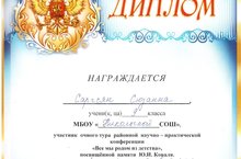 24 февраля ученики нашей школы принимали участие в IV Районной НПК «Все мы родом из детства”, посвященной памяти Ю.И. Коваля. Дипломом участника награждена Сарсян С., ученица 9 класса, в секции “Лучший слайдовый ряд”, Сертификатом участника в конкурсе чтецов, посвященному 200-летию со дня рождения М.Ю. Лермонтова среди учащихся 9-11 классов, награжден Бакланов Д., ученик 10 класса.
