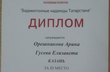 "Бадминтонные надежды Татарстана". Поздравляем ученицу 4 класса Гусеву Елизавету, занявшею III место в соревнованиях по бадминтону в возрастоной группе 2005-2006 г. р.Г 10.11.2015