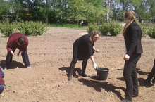 Работа на пришкольном участке. Ученики и учителя работают на участке. Сажаем морковь, лук, картошку, свеклу. 17.05.2016