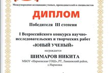 Ученик 9 класса Нармонской СОШ Шишмаров Никита стал победителем I Всероссийского конкурса научно-исследовательских и творческих работ «Юный ученый», проводимого Российской Академией естествознания. Руководитель – учитель математики Шайхутдинова С. Н. Молодцы! Поздравляем! 04.04.2016