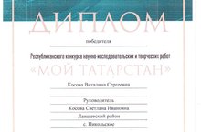 В канун нового года ученица 7 класса МБОУ "Никольская СОШ" Косова Виталина приняла участие в республиканском конкурсе научно-исследовательских и творческих работ "Наш Татарстан". Поздравляем Виталину с вручением ей диплома победителя! 27.12.2016