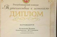За активное участие в VII республиканском конкурсе «Путешествие к истокам» награждается ученица 9 класса МБОУ Ташкирменской ООШ Кузнецова Ксения, руководителем является учитель истории и обществознания Сидорова Марина Терентьевна. 28.11.2016