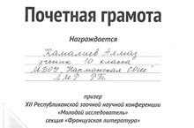 Камалиев Алмаз, ученик 10 класса МБОУ Нармонская СОШ стал призером XII Республиканской научной конференции "Молодой исследователь" секция " Французская литература"(учитель: Солягина Роза Ильгизовна). 01.06.2016