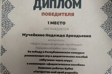 Поздравляем воспитателя Мучейкину Надежду Аркадьевну за победу 1 место в Республиканском конкурсе развивающих игр и дидактических пособий "Обучение через игру" в номинации: "Дидактическое пособие".