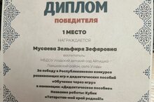 Поздравляем воспитателя Мусаеву Зельфирю Зефяровну за победу 1 место в Республиканском конкурсе развивающих игр и дидактических пособий "Обучение через игру" в номинации "Дидактическое пособие".