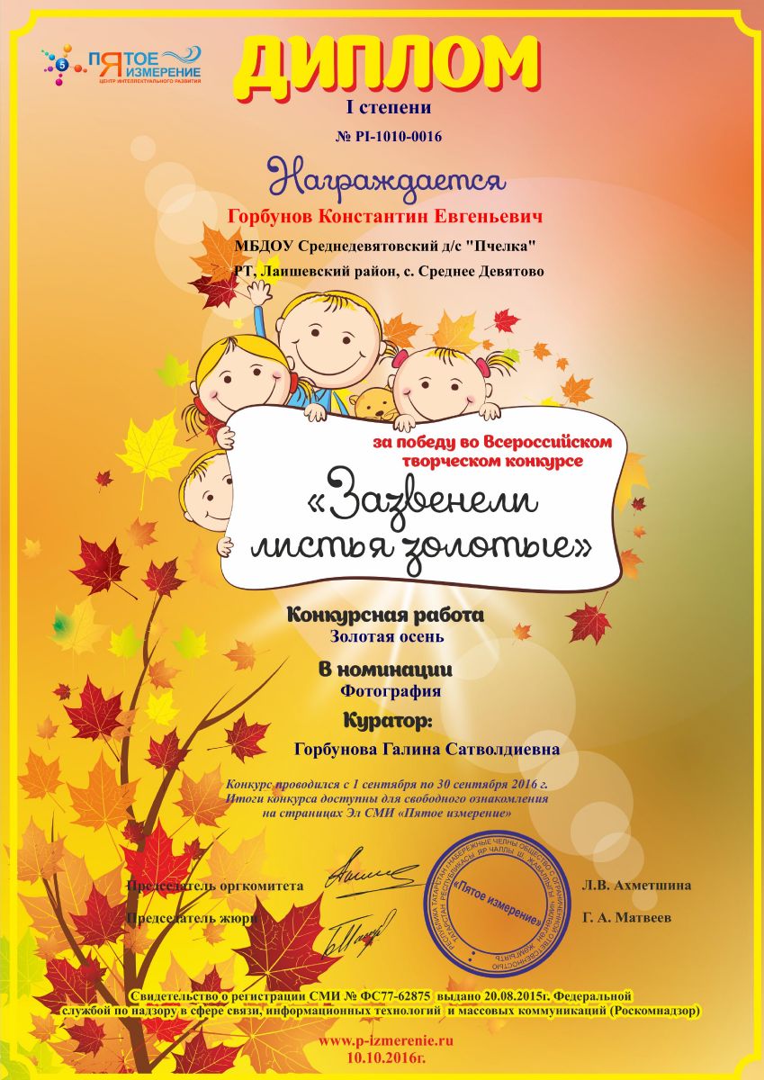 Поздравляем Горбунова Константина с победой во Всероссийском  творческом конкурсе "Зазвенели листья золотые"