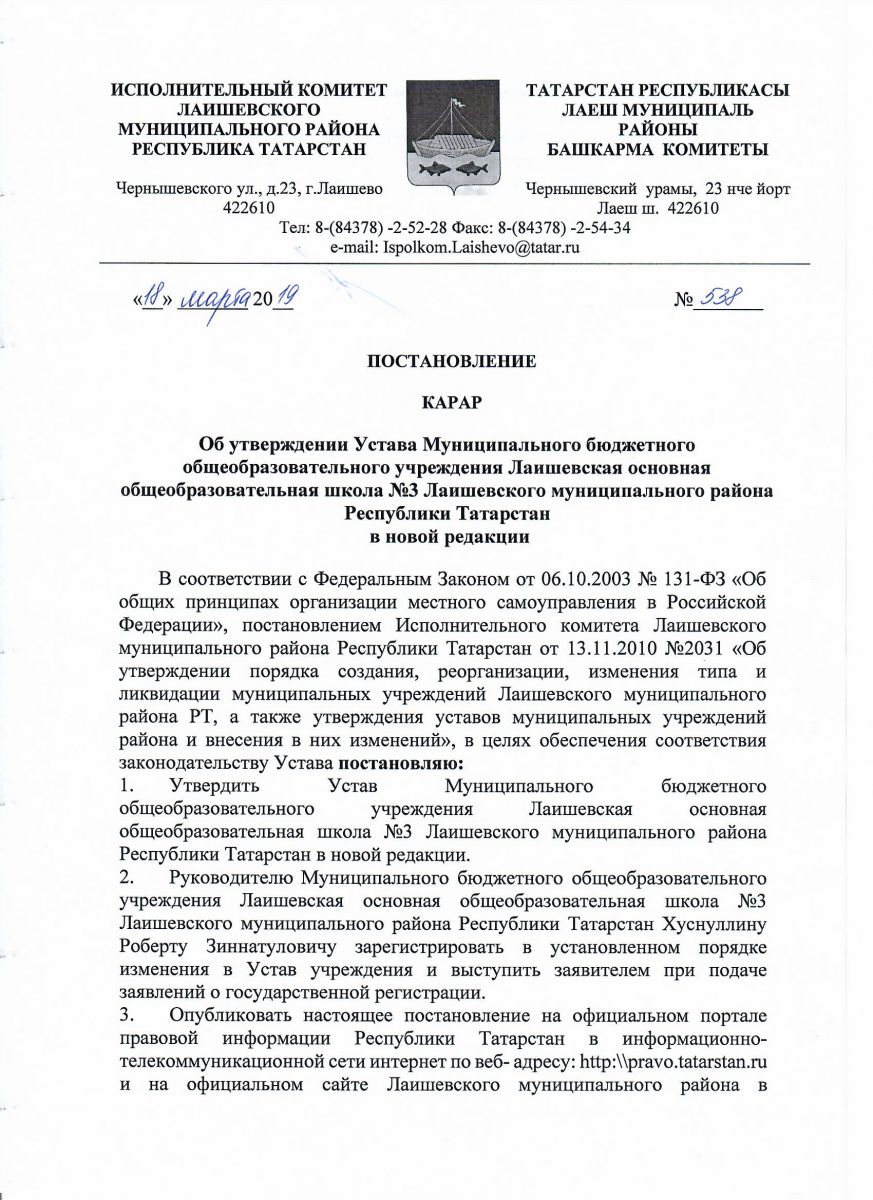 Постановление Исполнительного комитета об утверждении  Устава МБОУ ЛООШ №3        1 стр.       2 стр.