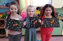 Девочки из группы "Яблочки", обучающиеся по дополнительной программе "Волшебный завиток", представили творческие работы, посвященные Дню космонавтики. Работы созданы в технике "квиллинг".