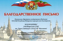 Благодарственное письмо от Регионального общественно-государственного объединения ДОСААФ Республики Татарстан вручено коллективу Столбищенской СОШ им. Героя Советского Союза А.П. Малышева за совместную и плодотворную работу в деле военно-патриотического воспитания молодежи.