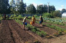 На пришкольном участке полным ходом идет работа по уборке лука, осуществляется полив грядок.
