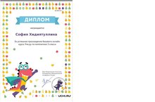 Совсем недавно ученики 3 а класса стали заниматься математикой на сайте Учи.ру и вот уже первые успехи! Хидиятуллина София награждена дипломом за прохождение базового курса по математике. Молодец!