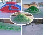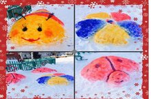 Сегодня, к примеру, силами учеников 7 класса были вырезаны из снега и раскрашены яркими красками две божьи коровки, аленький цветочек, необычная гусеница, а жизнерадостные ёлочки и снеговик уже на подходе от учеников 6 и 9 классов.