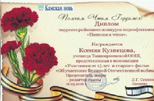Поздравляем ученицу 8 класса Кузнецову Ксению, которая стала лауреатом районного конкурса видеофильмов «Помним и чтим», представившая в номинации «Участники от 15 лет и старше» фильм «Об участнике Великой Отечественной войны». Руководитель Сидорова М.Т.