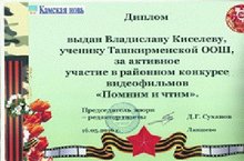 Поздравляем ученика 8 класса Киселева Владислава, которого наградили дипломом за активное участие в районном конкурсе видеофильмов «Помним и чтим». Руководитель Киселева И.А.
