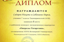 Поздравляем учащихся 7 класса Сабанаеву Дарью и Сидорова Никиту с победой в районном конкурсе экскурсионных маршрутов «Ожерелье Татарстана»