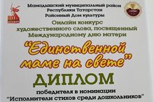 Диплом победителя онлайн конкурса художественного слова, посвященный Международному дню матери "Единственной маме на свете" в номинации "Исполнители стихов среди дошкольников" награждается Хасаншина Залина, возрастная категория: от 3 до 6 лет. Поздравляем нашего воспитанника! Желаем дальнейших успехов!