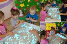 Воспитатель Эдьвира Нургаяновна Ахметшина провелас детьми мастер -класс "Ласковое солнышко", целью которого было развитие мелкой моторики рук, восприятия мышления, фантазии. Дети вместе с воспитателем на специальном столе рисовали солнышко песком. Польза рисования песком для детей - в стимуляции творческих способностей, развитии воображения, памяти.