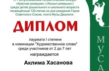 Диплом 1 степени в номинации "Художественное слово " среди воспитанников и учеников с 2-7 лет. в IV Республиканском патриотическом конкурсе "Красная ромашка" среди детей дошкольного и школьного возраста посвященный 120-летию со дня рождения Героя Советского союза , поэта Мусы Джалиля. 09.04.2026