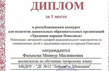 Первое место в региональном конкурсе авторских методических разработок "Игровая технология (квест- игра) по ознакомлению старших дошкольников с творчеством и культурой народов Поволжья" 07.03.2023