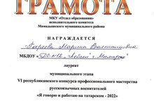 Подведены итоги муниципального этапа VI республиканского конкурса профессионального мастерства русскоязычных воспитателей "Я говорю и работаю на татарском -2022г. Наш педагог Гареева Марина Валентиновна лауреат конкурса . Поздравляем!" 09.12.2022